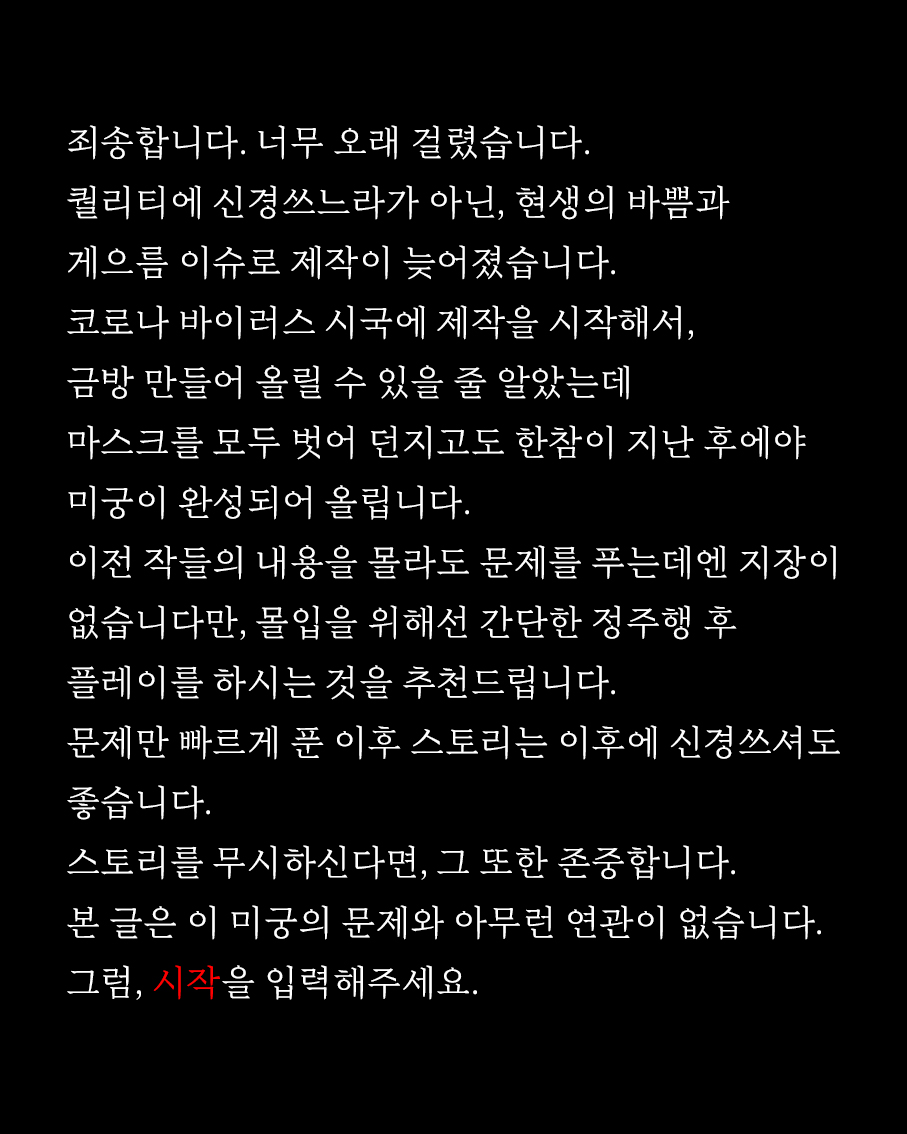 미궁게임 🔥 도전과제 전체미궁 인증미궁 자유미궁 기획미궁 외부미궁 랭킹 이 주의 추천미궁 게시판 전체게시판 공지사항 자유게시판 미궁 질문게시판 미궁 제작팁 미궁 추천・후기 방탈출 추천・후기 투표게시판 건의게시판 회원 서비스 로그인 비밀번호 찾기 미궁게임 더라비린스 오늘의 퀴즈 출석 체크 무료 웹호스팅 더라비린스 소개 개인정보 취급방침 서비스 이용약관 사이트 운영정책