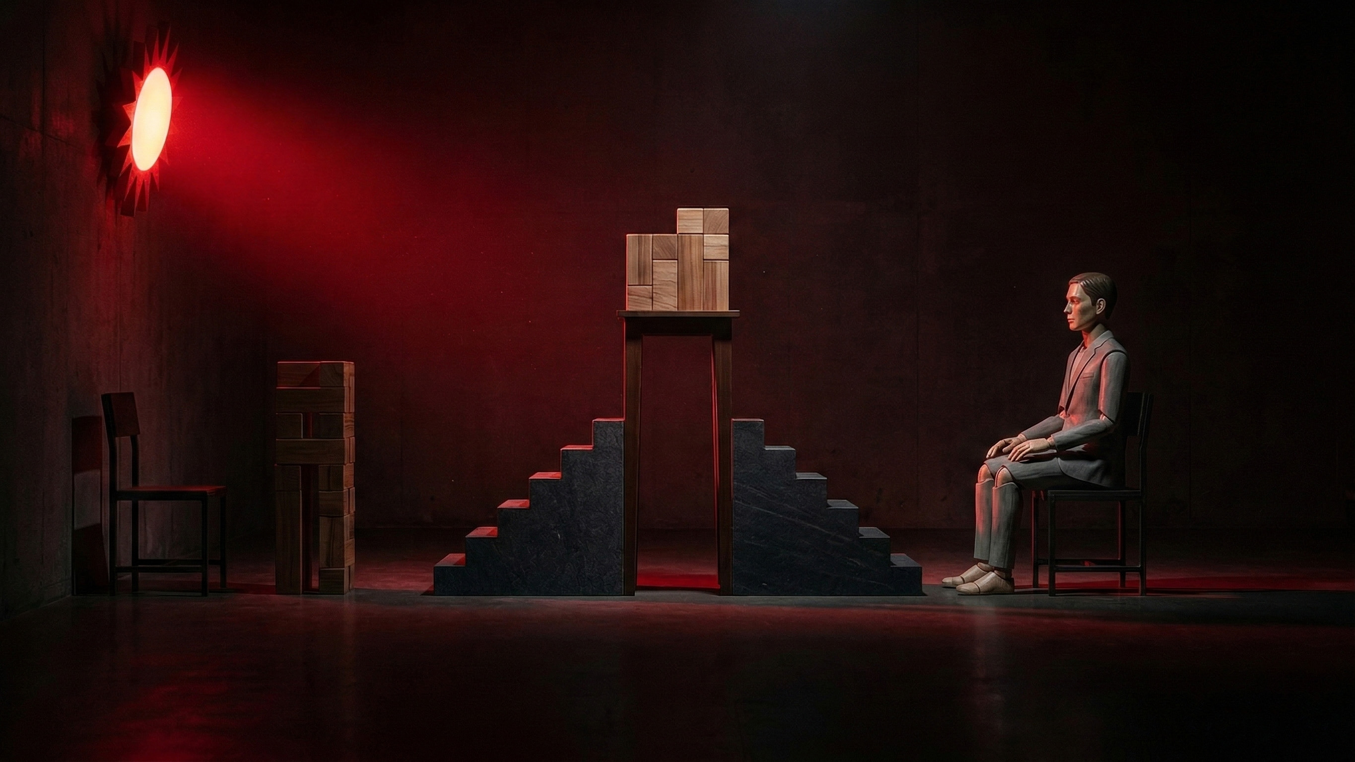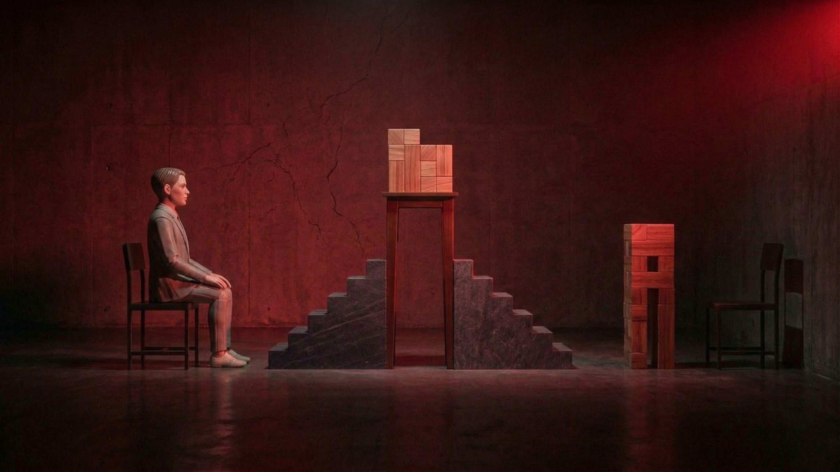 붉은 빛 하나가 어둠 속에서 소년을 바라보고 있다. 소년은 빛을 등지고 앉아, 자신에게 닿지 않는 무언가를 향해 시선을 보내고 있다. 그 사이에 놓인 계단은 오를 수도, 내려갈 수도 있지만, 어느 쪽도 빛과 소년을 연결해 주지는 않는다.