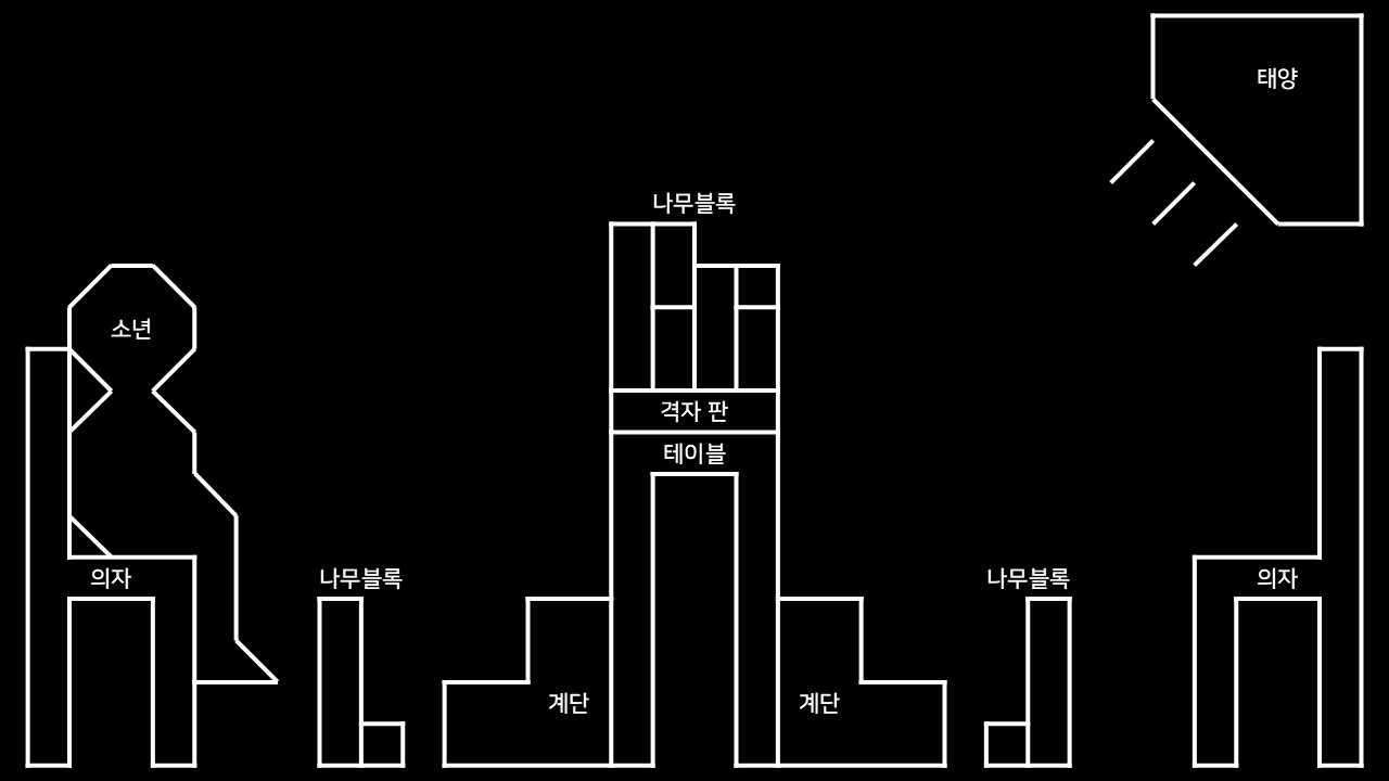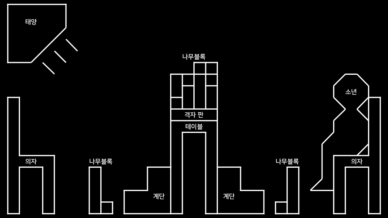 해와 소년은 정사각 격자 판 위에서 나무 블록을 배치하는 놀이를 하고 있었다. 소년의 배치가 마음에 들지 않았던 해에게는 소년에게 전하고 싶은 말이 있었다. 공교롭게도 소년의 배치는 이를 숨기기에 적절했고, 해는 빛을 밝혔다. 소년은 다음 블록을 두기 위해 계단을 오르는 순간, 비로소 그것을 알아차렸을 것이다.