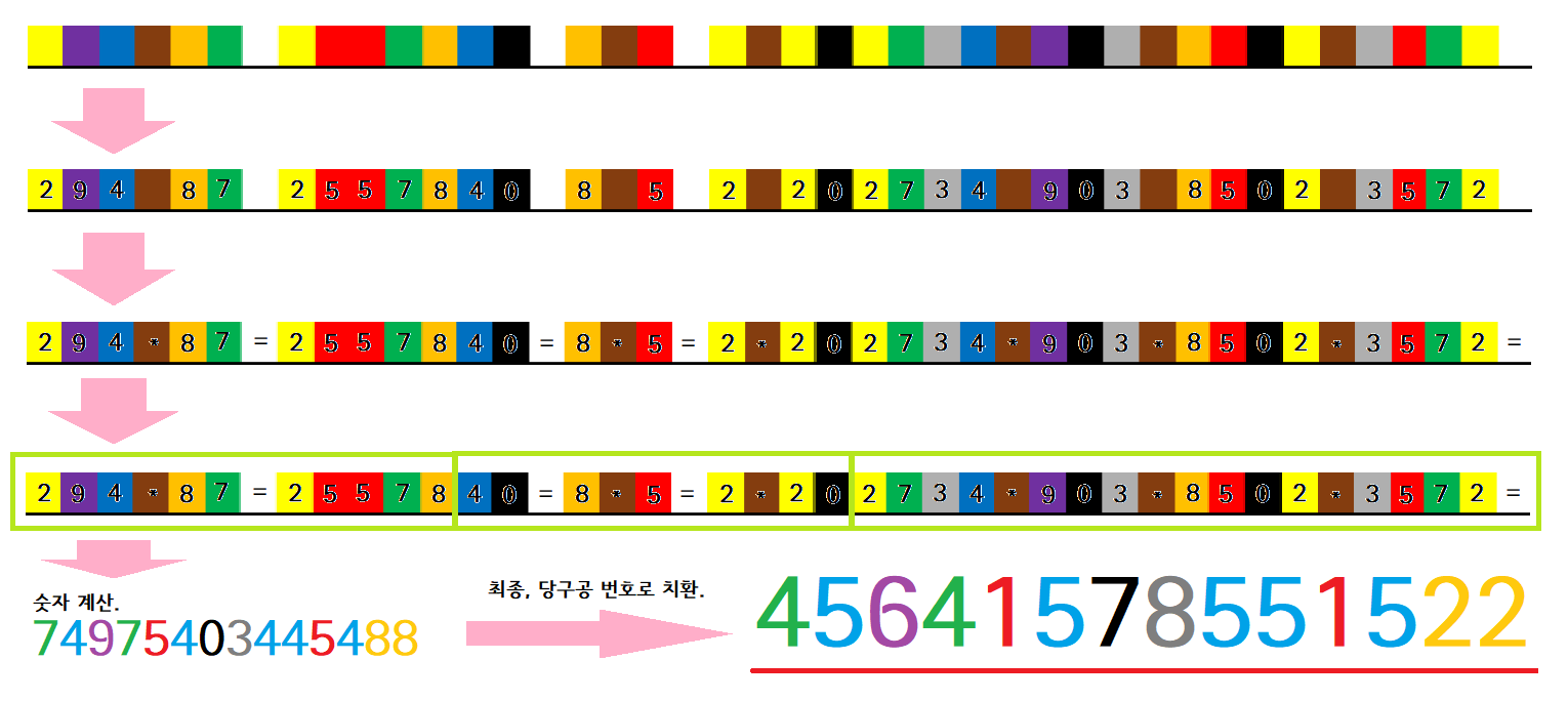즉, 마지막으로 정답은 (결과 숫자값) -> (매칭되는 당구공 색상) -> (해당 당구공의 넘버) 로