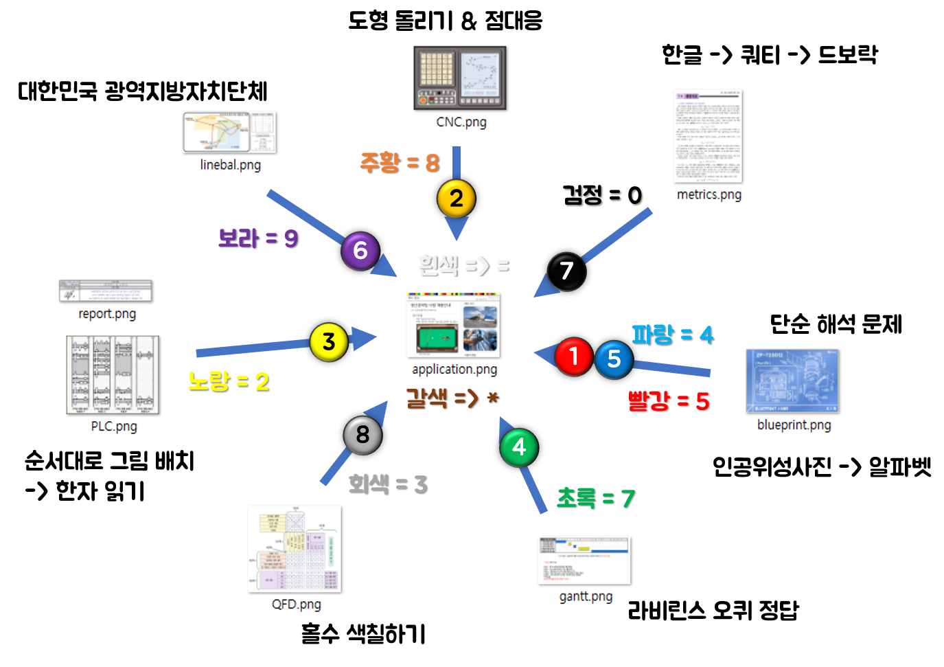 우선, 저희가 기존에 알고있는 색상에 대한 넘버를 다 집어넣어줍시다. (첫번째 화살표 과정)