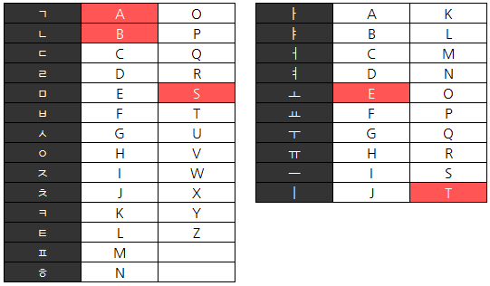 한글 자모음을 알파벳으로 바꾸고 자음과 모음은 색으로 구분했습니다.