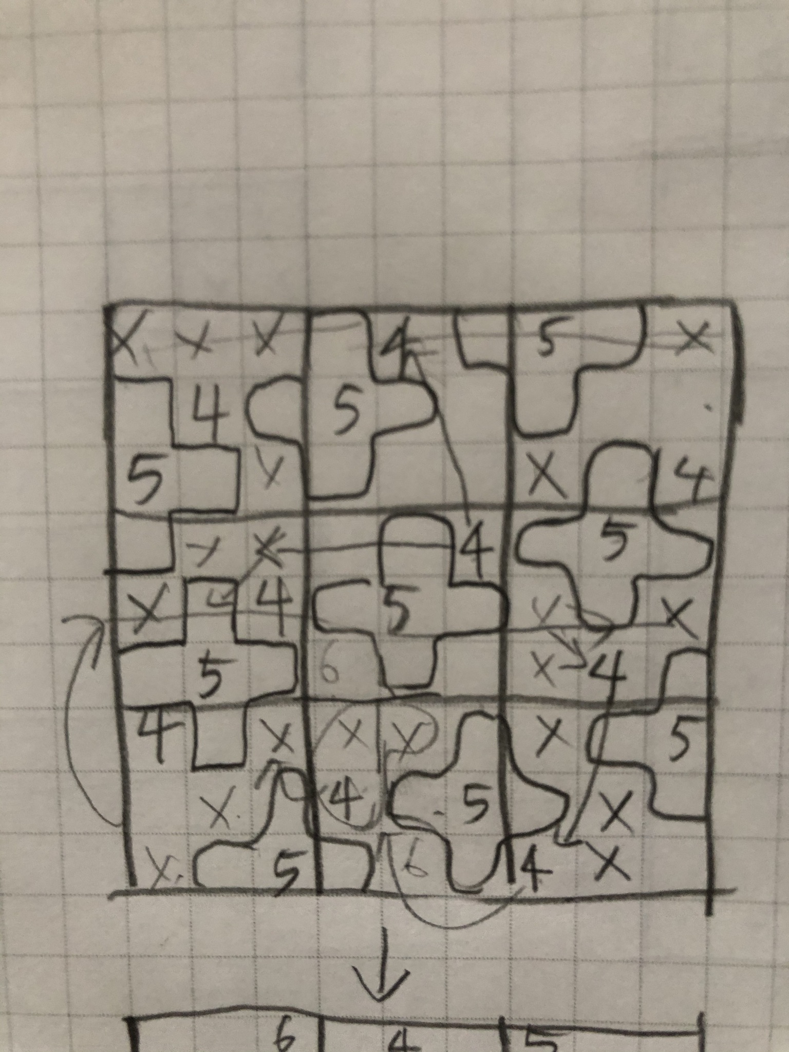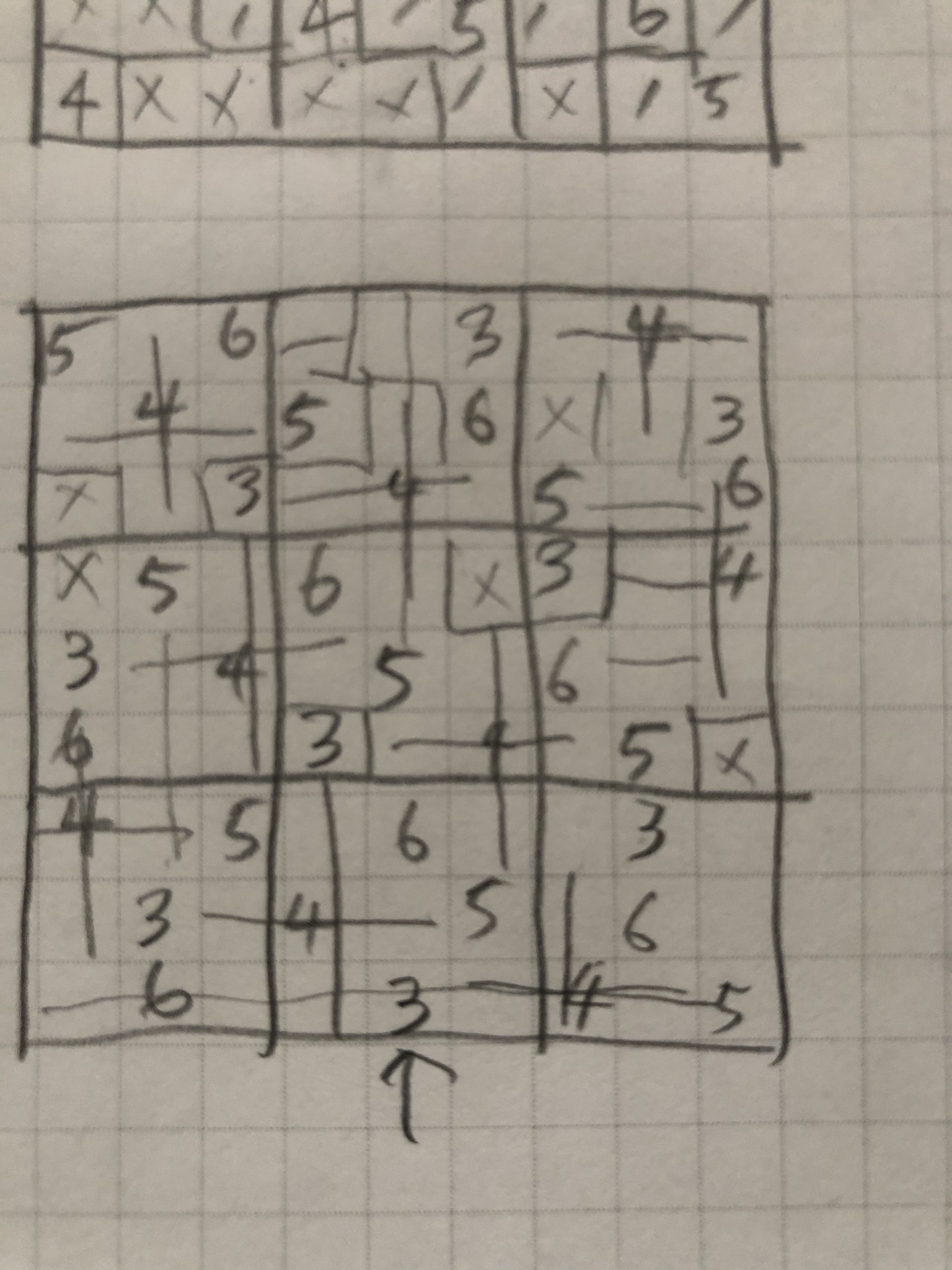 5가 다음과 같은 케이스의 경우 5근처를 모두 x표시하고 4를 중앙큰칸에 넣어보면 바로 4 넣은 근처 큰칸에 4가 안들어감을 알 수 있습니다.