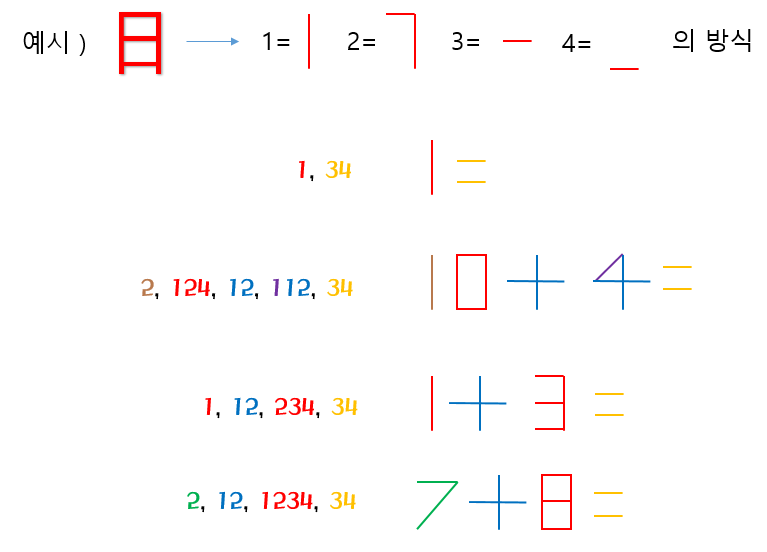 예를 들어 빨간색 1은 빨간색인 日의 첫 번째 획을 뜻하고 주황색 34는 주황색인 月의 세 번째와 네 번째 획을 뜻합니다.