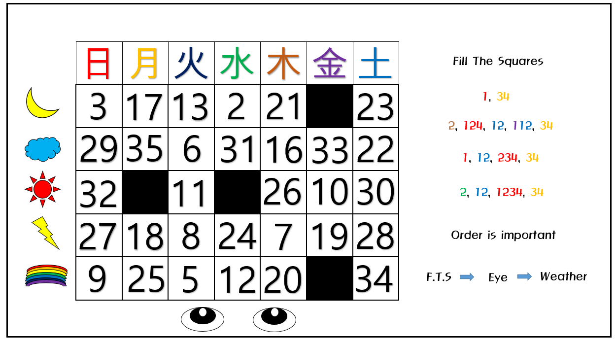 우선 가이드라인에 나와있는 대로 F.T.S를 해결하면 되는데 여기서 F.T.S.는 말 그대로 위에 나와있는 Fill The Squares를 뜻합니다.